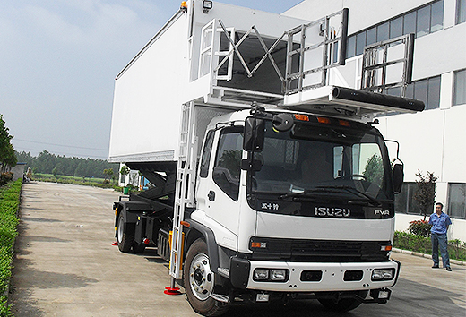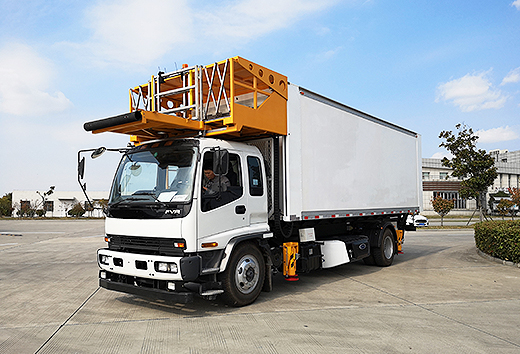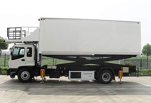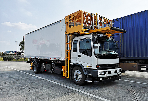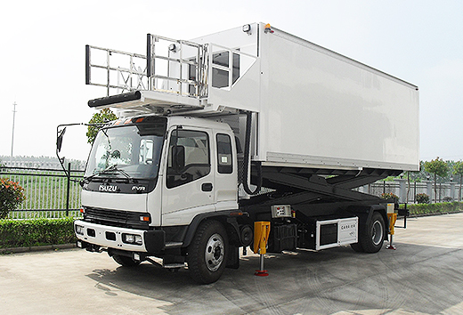 CT-SP600食品車為安裝在ISUZU FVR商用底盤上的飛機(jī)食品車,通過(guò)液壓剪刀機(jī)構(gòu)實(shí)現(xiàn)廂體的升降。此車型可服務(wù)于艙門高度為2740mm到6020mm的所有機(jī)型。